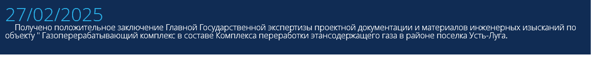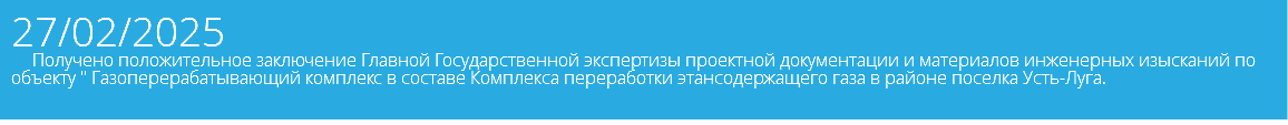 | 1 | Газоперерабатывающий комплекс в составе Комплекса переработки этансодержащего газа в районе поселка Усть-Луга. Этапы 5.1, 5.2, 5.3, 5.4, 5.5, 5.6, 6.1, 6.2, 6.3, 6.4, 6.5, 6.6, 6.7. Товарно-сырьевая база, Морской отгрузочный терминал | Россия, Ленинградская область, Кингисеппский муниципальный район, Морской порт Усть-Луга, район посёлка Усть-Луга | ООО "РУСХИМАЛЬЯНС" | № 47-1-1-3-010546-2025 от 27.02.2025г. Проектная документация и результаты инженерных изысканий | Субподрядчик |